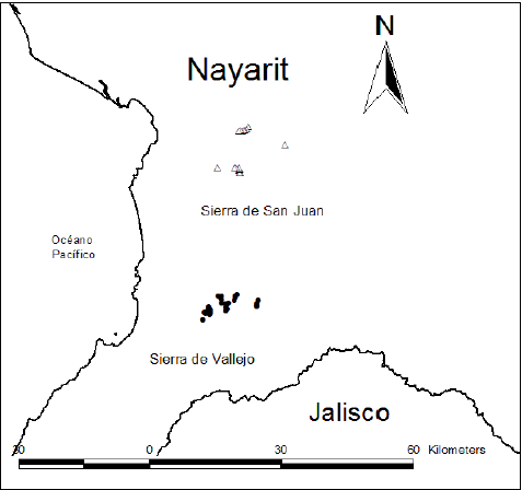 Localización del área de estudio de dos zonas cafetaleras en el oeste de México. Los triángulos blancos muestran los puntos de conteo realizados en Sierra de San Juan y los círculos negros los puntos de conteo realizados en Sierra de Vallejo.