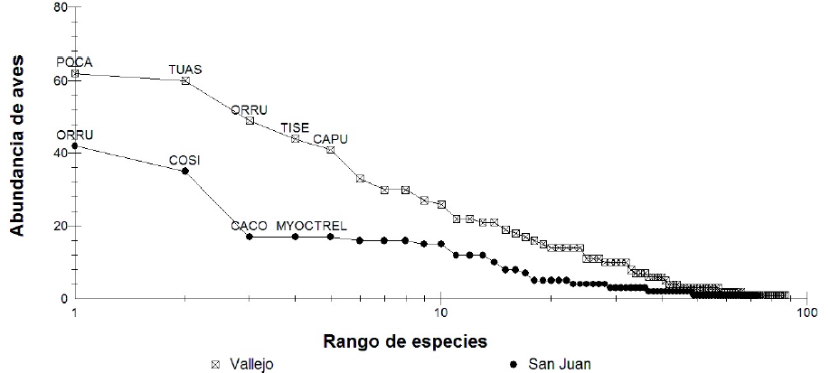 Realizamos el análisis con un total de 1,271 individuos pertenecientes a 109 especies, de este total, 874 individuos corresponden a Sierra de Vallejo y 397 a Sierra de San Juan. En Vallejo dos especies fueron abundantes (Polioptila caerulea y Turdus assimilis) y tres fueron comunes (Oreothlypis ruficapilla, Tityra semifasciata y Cardellina pusilla); en conjunto estas cinco especies constituyeron el 31.5% del total de los individuos observados, mientras que el 54% de las especies fueron raras con una abundancia relativa de no más del 8% (Figura 2). Por el contrario, en los cafetales de Sierra de San Juan sólo Oreothlypis ruficapilla fue abundante mientras que Corvus sinaloae fue una especie común, ambas especies en conjunto representaron el 19.4% de las observaciones, mientras que más de la mitad de las especies (61.6%) se observaron en baja abundancia (Figura 2). La diversidad de la comunidad de aves en Sierra de Vallejo es 1.25 veces más alta que la de San Juan, pues se registraron 32.5 y 25.9 especies efectivas, respectivamente.