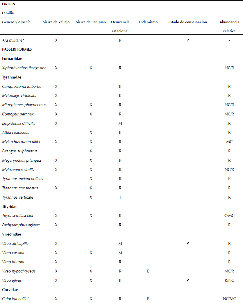 Del total de las especies, 89 son residentes, 33 son migratorias y una es transitoria (Tyrannus verticalis). Respecto al estado de conservación, 14 especies se encuentran en alguna categoría de riesgo, de ellas, seis se encuentran en “Protección Especial”, cinco especies están “Amenazadas” y finalmente, tres se encuentran en “Peligro de Extinción” (Anexo 1). Por otra parte, en Sierra de Vallejo y en Sierra de San Juan observamos 72 y 54 especies residentes, así como 25 y 22 especies migratorias, respectivamente. De las residentes 16 son endémicas y 11 cuasiendémicas.