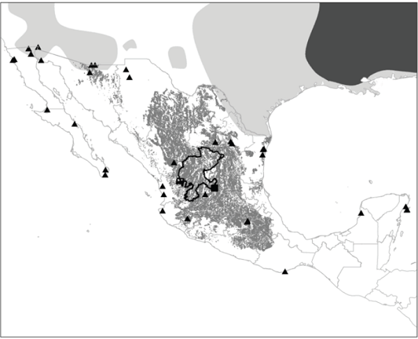 Registros históricos de Lophodytes cucullatus en México (en triángulos; gbif 2015) y el registro actual en Zacatecas (en un cuadro). En el interior del país, en gris, se muestra la distribución potencial de la especie (Navarro y Peterson 2007), así como el límite estatal de Zacatecas resaltado en negro. Al norte se muestran áreas de su distribución más sureña de residente no reproductivo (gris claro) y de residente permanente (gris oscuro; BirdLife International y NatureServe 2014).