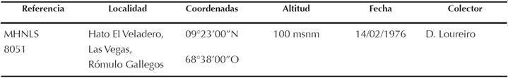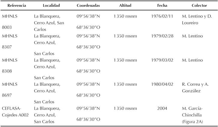 Hasta hoy, en el estado Cojedes no había sido mencionada la presencia de A. sulcatus en ninguno de los trabajos sobre aves publicados para Venezuela (Phelps y Meyer de Schauensee 1979, Hilty 2003, Restall et al. 2007). Las referencias inéditas a esta especie las encontramos en cuatro especímenes depositados en la Colección de Ornitología del Museo de Historia Natural La Salle (MHNLS 8003, 8307, 8308 y 8697), colectados en 1976, 1979 (2) y 1980, en el área de Cerro Azul (Macizo de Nirgua), entre los 1 350 y 1 400 msnm (Cuadro 1). Adicionalmente, existe un espécimen conservado en la Colección Entomológica de la Fundación La Salle de Ciencias Naturales - Campus Cojedes (CEFLASA-Cojedes A002) que fue cazado el 22 de febrero de 2004, en la misma área (Miguel García-Chinchilla, com. pers.) (Figura 2A). Dichos ejemplares, fueron identificados como cuatro adultos y un juvenil. No se conservan especímenes colectados en Cojedes en las demás colecciones ornitológicas revisadas.