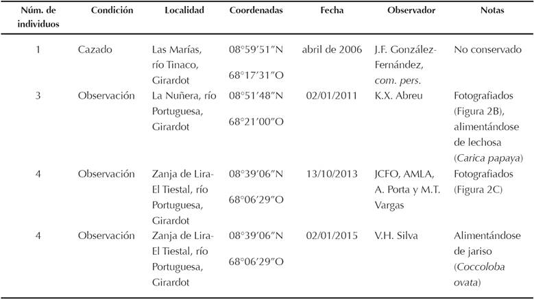 En la actualidad, aun habiéndose realizado trabajos ornitológicos en la zona sur del estado Cojedes, no existían datos publicados sobre la presencia de esta especie (Fundación Branger 1996, Ascanio 2005, Ascanio y García 2005). La única referencia inédita, durante el siglo XX, la encontramos en un espécimen conservado en la Colección de Ornitología del Museo de Historia Natural La Salle (MHNLS 8051) que fue colectado en 1976, en Hato El Veladero (municipio Ricaurte), cerca del río Cojedes, a 100 msnm (Cuadro 2). No se conservan, en ninguna otra colección ornitológica revisada, otros especímenes colectados en Cojedes. Las referencias inéditas más recientes las encontramos todas en la parroquia de El Baúl (municipio Girardot), al sur del estado: un ejemplar cazado en 2006, en el río Tinaco (J.F. González-Fernández, com. pers.); un ejemplar fotografiado en 2011 a orillas del río Portuguesa (K.X. Abreu, com. pers.; Figura 2B); cuatro ejemplares en 2013 (Figura 2C) y 2015 fotografiados en el sector Zanja de Lira-El Tiestal (J.C. Fernández-Ordóñez, A.M. León, A. Porta, M.T. Vargas y V.H. Silva) (Cuadro 3).