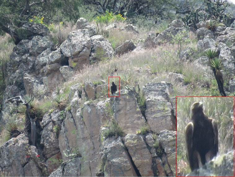 Los avistamientos del águila real fueron obtenidos durante una prospección de fauna efectuada en el arroyo El Rejalgar situado en las inmediaciones de la comunidad de Mesita del Tigre, municipio de Victoria, Guanajuato. Los días 23, 24 y del 26 al 29 de mayo de 2015 recorrimos a pie brechas y veredas que seguían el curso del mencionado arroyo en dirección oeste-este, así como recorridos a pie en dirección este-oeste situados en la ladera sur; cubrimos los tres tipos de vegetación presentes: matorral crasicaule, matorral submontano y pastizal natural. Los trayectos andados fueron de 2.7 km, y en diferentes direcciones durante cada día de muestreo, se eligieron en función de la topografía del terreno, facilidades de acceso y visibilidad. Efectuamos observaciones con binoculares Bushnell fov 393ft 8x42. Como evidencia del registro obtuvimos fotografías y videos con una cámara Canon Sx60 hs con zoom de 65x.