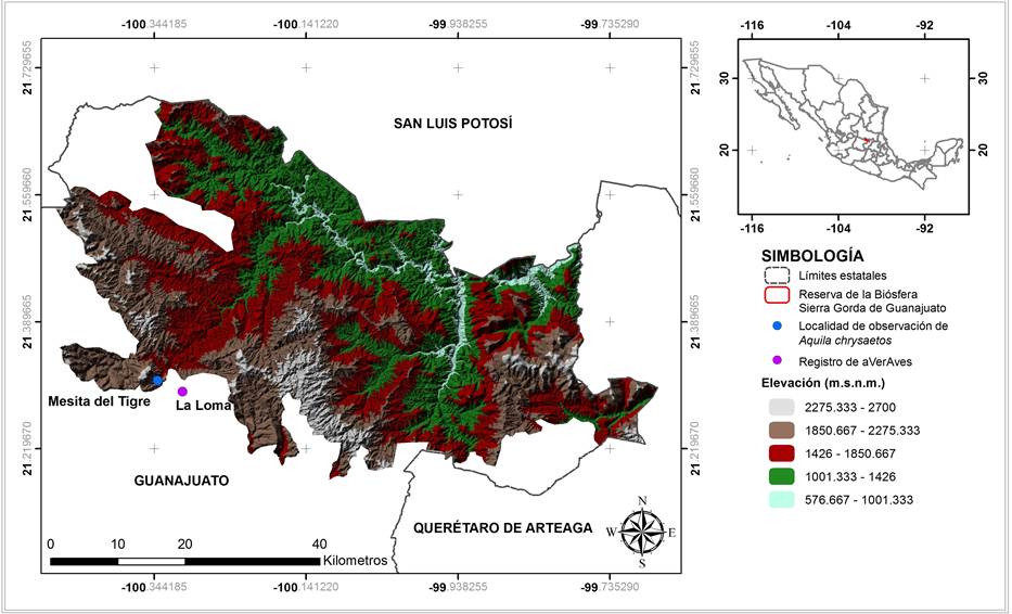 Nuestro registro es el primero para la RBSGG. En la base de AverAves <ebird.org> localizamos un registro de águila real en las inmediaciones de la comunidad de La Loma, municipio de Victoria, Guanajuato, de 2013, a una distancia aproximada, en línea recta, de 3.8 km al sureste de Mesita del Tigre (Figura 2). Este último registro se encuentra fuera de la poligonal de la RBSGG. La presencia de águila real no fue mencionada en el estudio previo justificativo para el establecimiento de la RBSGG (SEMARNAT y CONANP 2008) ni en el documento para consulta pública del programa de manejo correspondiente (CONANP 2013). Consideramos que esta especie no había sido reportada previamente en dicha ANP debido a la ausencia de estudios sistemáticos sobre aves rapaces en la región y a que varias de las áreas con condiciones apropiadas para la presencia de la especie son de muy difícil acceso.