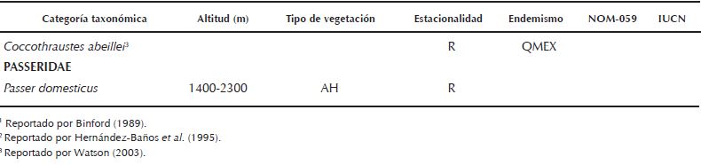 Mediante las observaciones de campo incrementamos los límites altitudinales superiores de Sittasomus griseicapillus de 2 000 a 2 600 msnm, de Basileuterus lachrymosa de 1 800 a 2 614 msnm y de Aimophila notosticta de 1 900 a 2 155 msnm (Binford 1989, Howell y Webb 1995, Gómez de Silva 1997, Schaldach et al. 1997, Bojorges-Baños 2004, DeSucre-Medrano et al. 2010). Por otro lado, de Psaltriparus minimus ampliamos el límite altitudinal inferior de 1 500 a 1 300 msnm (Howell y Webb 1995) (Cuadro 1).