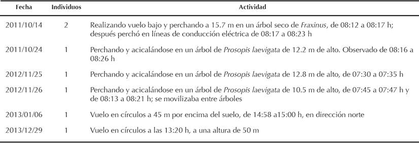 Los periodos en que se observó la especie a lo largo de cuatro temporadas invernales fueron: del 10 de octubre de 2011 al 7 de marzo de 2012, del 7 de octubre de 2012 al 4 de abril de 2013 y del 2 de noviembre de 2013 al 6 de abril de 2014. El área de las observaciones es una zona suburbana con arboledas abundantes de Prosopis y pequeñas fincas con cultivos de maíz, 20 km al sur del lago de Cuitzeo. Por su ubicación, esta zona suburbana de Morelia constituye uno de los puntos de distribución más meridionales de la porción occidental de México (Figura 2).