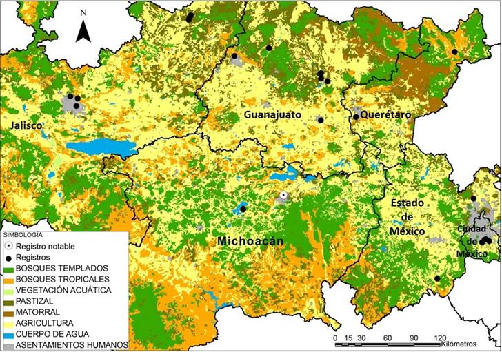 Por medio de la revisión de las bases de datos disponibles (GBIF 2015 y eBird 2015) compilamos un total de 1 065 registros de la especie para 20 estados mexicanos, la mayoría de ellos correspondientes a las zonas del norte de México. El registro histórico más antiguo (un ejemplar colectado por A. C. Buller en el área de Guadalajara, Jalisco y depositado en el Museo de Historia Natural de la Universidad de Kansas) se remonta a 1892. Entre los registros más actuales (entre el año 2000 y el presente), hay 60 registros del centro-occidente de México, incluida la Ciudad de México (19), y los estados de Guanajuato (15), Jalisco (10), Nayarit (7), Querétaro (6) y el Estado de México (3). Todos los registros disponibles cubren el periodo de octubre a febrero (octubre=21.7%, noviembre=10%, diciembre=28.3%, enero=23.3% y febrero=16.7%). Sin embargo, no hay registros de aguililla pecho-rojo que se hayan publicado o estén disponibles en bases de datos para el estado de Michoacán, por lo que la especie no ha sido incluida en ninguna lista de especies ornitológicas o estudio hasta el presente (Villaseñor-Gómez 2005). La observación más reciente corresponde a un individuo observado en Ojo de Agua de Tzintzuntzan (19.632107ºN, 101.563900ºO; Datum DGS84; 2 054 msnm) por Georgia Conti, el 28 de diciembre de 2009 (ebird.org/ebird/view/checklist?subID=S25628734).