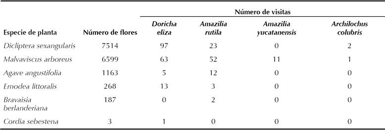 Registramos cuatro especies de colibríes Doricha eliza, Amazilia rutila, A. yucatanensis y Archilochus colubris. Del total de las 285 visitas a flores de las seis especies de plantas observadas (Cuadro 1) D. eliza y A. rutila fueron las especies que realizaron más visitas (179 y 92 respectivamente), mientras que A. yucatanensis y A. colubris fueron las que realizaron menos (11 y 3 respectivamente).