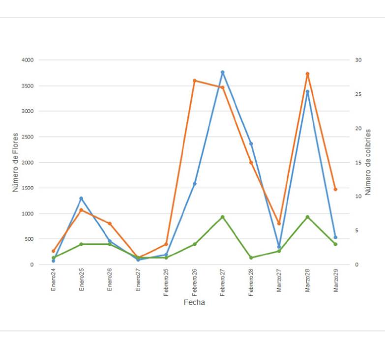 Decidimos realizar el estudio sólo en el periodo de enero a marzo, pues permitiría representar uno de los trimestres más secos del año en la localidad. En ese trimestre, con temperaturas cálidas (en promedio de 26 a 28°C; CNA 2010), muy pocas especies producen flores en la RBRL (Campos-Navarrete et al. 2013), lo cual da como resultado condiciones críticas que pueden determinar la presencia y abundancia de colibríes y otros polinizadores.