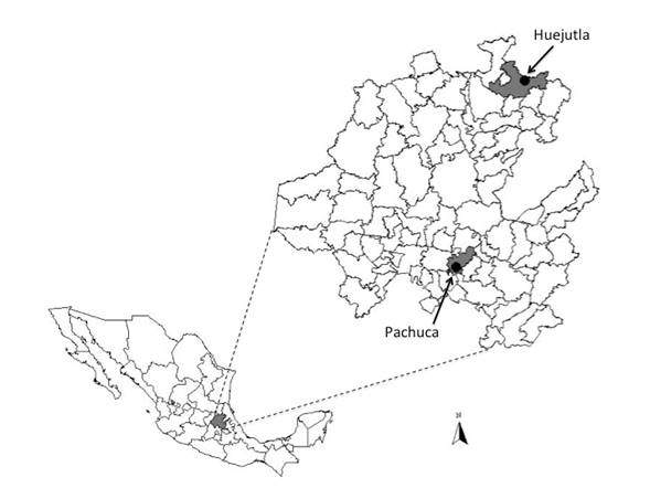 Esta especie se registró por primera vez en México en 1999 en el estado de México (Chávez 1999). A partir de entonces se ha reportado en la Ciudad de México y áreas adyacentes (Ramírez-Albores 2012) y en los estados de Puebla, Chiapas, Michoacán (MacGregor-Fors et al. 2011), Oaxaca (Pablo-López 2009), Baja California Sur (Guerrero-Cárdenas et al. 2012), Querétaro (Pineda-López y Malagamba Rubio 2011), Guanajuato (Pineda-López et al. 2013), Morelos (Jiménez Piedragil et al. 2013), Chihuahua (Soto-Cruz et al. 2014), Veracruz (González-García et al. 2014), Guerrero (Almazán-Núñez et al. 2015) y estado de México (Salgado-Miranda et al. 2016). En este trabajo presentamos los primeros reportes de la presencia de M. monachus para el estado de Hidalgo. Desde el 2011 hemos registrado individuos y nidos de esta cotorra en dos ciudades del estado ubicadas en dos municipios distintos: Huejutla de Reyes y Pachuca de Soto (Figura 1).