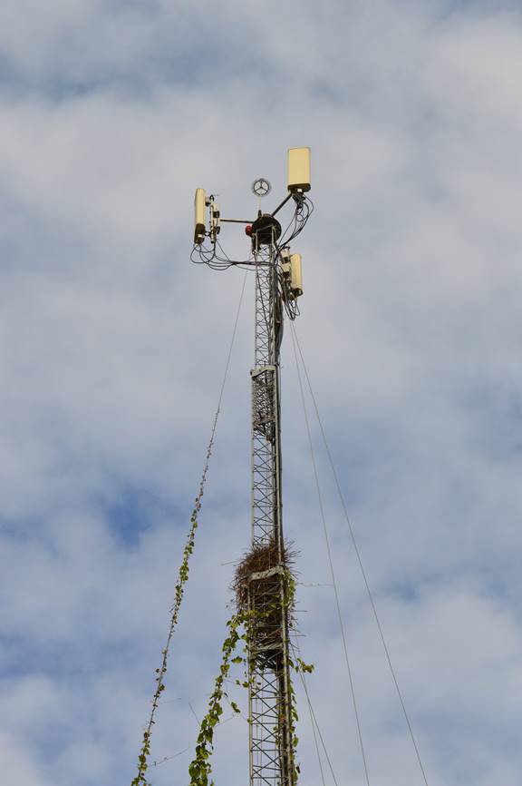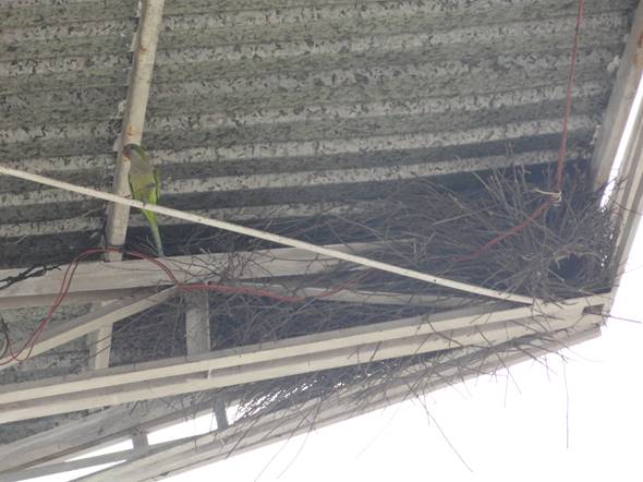 En abril y mayo del 2011 observamos una pareja de adultos anidando en el travesaño de una galera metálica (Figura 2) en el terreno de la Feria de Nochebuena, (21º09’18.24” N, 98º23’8.09” O) en la colonia Todos por Hidalgo en la ciudad de Huejutla, municipio de Huejutla de Reyes, a 111 m de altitud. El nido se encontró en la zona periurbana al noreste de la ciudad y el área se caracteriza por presentar zonas habitacionales dispersas entre campos de cultivo. Se observó a los adultos cortando ramas de árboles de eucalipto (Eucalyptus sp.) y transportándolas al nido. En abril de 2013 observamos una cotorra anidando en una antena de telefonía (Figura 3) a una altura aproximada de 20 m, ubicada en la colonia El Paraíso de las Huastecas en la misma ciudad (21º09’08.90” N, 98º23’52.42” O) a 109 msnm, también al noreste de la ciudad y dentro de una zona altamente urbanizada rodeada por algunos campos de cultivo. Durante el 2014 y el 2015 se observaron esporádicamente de dos a tres individuos adultos cerca de ambos sitios de anidación.