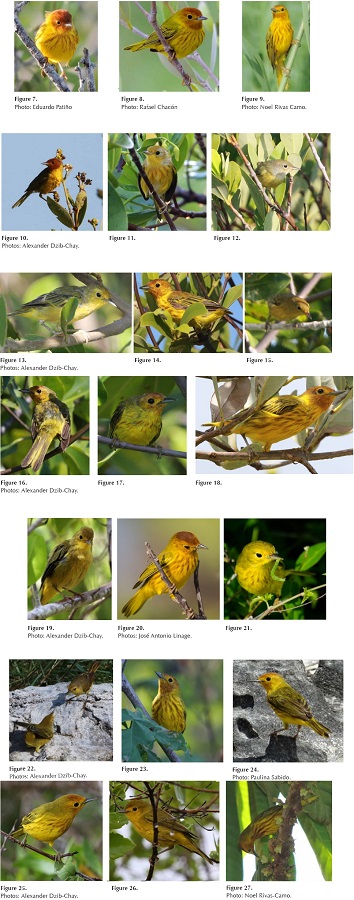 The objective of this paper is to describe a new population of Yellow Warbler (Setophaga petechia) that we discovered serendipitously on Cozumel. We concentrated on photographing plumages of different ages and sexes, and exploring areas of mangrove wetlands in order to understand the distribution of the bird on the island in relation to habitat type. Cozumel Island is known to have the endemic Golden Warbler (Setophaga petechial rufivertex) (Figures 1 and 2), one of 43 subspecies of the Yellow Warbler (Browning 1994, Dunn and Garrett 1997, Salgado-Ortiz et al. 2008). Dr. Raymond Paynter, Jr. described the habitat of this bird as follows: “Bushes and small trees throughout the island” (Paynter 1955), while Griscom stated: “Dendroica ruficapilla (=Setophaga petetchia) rufivertex Ridgway - This species of obvious Antillean relationship replaces Dendroica (=Setophaga petechia) bryanti, which is abundant on the adjacent mainland, wherever mangroves exist. The Cozumel Yellow Warbler is not a Mangrove Warbler, but is abundant throughout the island” (Griscom 1926). Howell and Webb (1995) confirm that the Cozumel Golden Warbler is found in scrubby woodland and mangrove edge. The only habitat in which we have not found it is in vegetation composed of only mangrove species such as islands located within lagoon systems. The plumage coloration that distinguishes the two subspecies from each other includes the rufous color of the crown and the breast streaks of the Golden Warbler as opposed to the deeper chestnut-colored hood of the Mangrove Warbler (pers. obser. and photos).