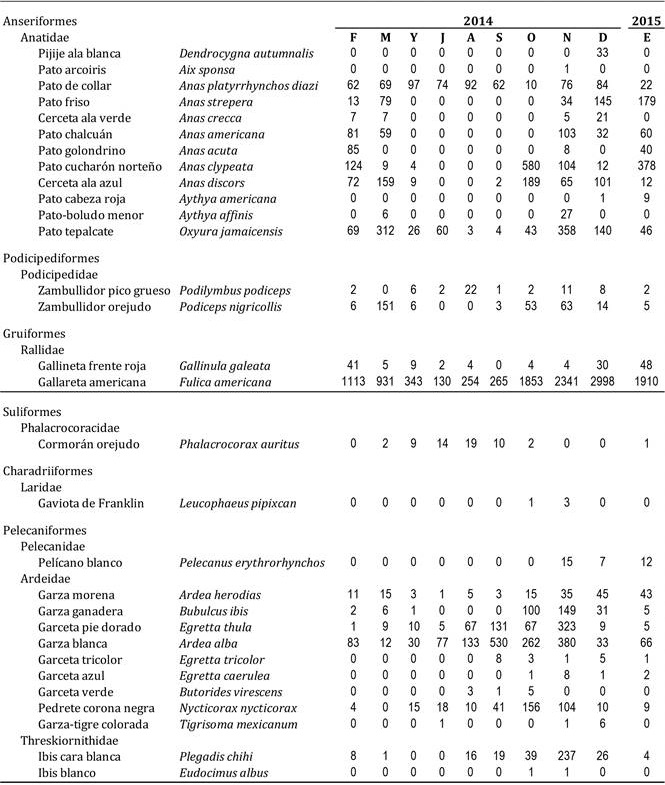 Rose (2012) reportó para Valsequillo un total de 169 especies de aves, de las cuales 33% son acuáticas; pero al listado se siguen añadiendo nuevos registros de aves acuáticas (Berumen Solórzano et al. 2016). En realidad, la información disponible sobre la avifauna acuática y migratoria de este sitio Ramsar es escasa (Rose 2012), y no se ha estudiado la diversidad de aves acuáticas, y qué variación temporal presenta. El objetivo de este estudio fue incrementar el conocimiento sobre la diversidad y los cambios temporales de la avifauna acuática de la Presa de Valsequillo. Para ello, (1) describimos los patrones de cambio en la estructura de la comunidad de aves acuáticas de Valsequillo, en términos de su abundancia, riqueza y diversidad, entre febrero de 2014 y enero de 2015, (2) evaluamos las diferencias entre periodos del año (i.e., grupos de meses), definidos en función de la composición y abundancia de la comunidad de aves acuáticas, y (3) identificamos las especies que indican las diferencias entre los periodos del año analizados.