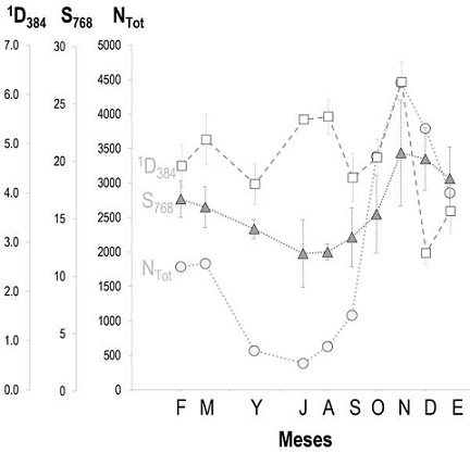 Aunque el número total de especies fue 30, la riqueza media esperada en cada mes con 768 individuos varió entre 12 (julio-septiembre) y 20 especies (noviembre-diciembre). De hecho, la riqueza estandarizada a 768 individuos (S768) fue el descriptor de la estructura de la comunidad menos variable a lo largo del tiempo (CV = 19.9%), y siguió un patrón temporal muy similar al de NTOT (coeficiente de correlación no paramétrico de Spearman, rs = 0.879; P = 0.0008; n = 10) (Figura 1). Finalmente, la diversidad esperada con 384 individuos (1D384) también varió poco entre meses (CV = 21.6%), pero mostró un patrón temporal menos claro (Figura 1). El mínimo se registró en diciembre (1D384 = 2.8 especies equiprobables) y el máximo en noviembre (6.3 especies equiprobables; i.e., 2.25 veces más).