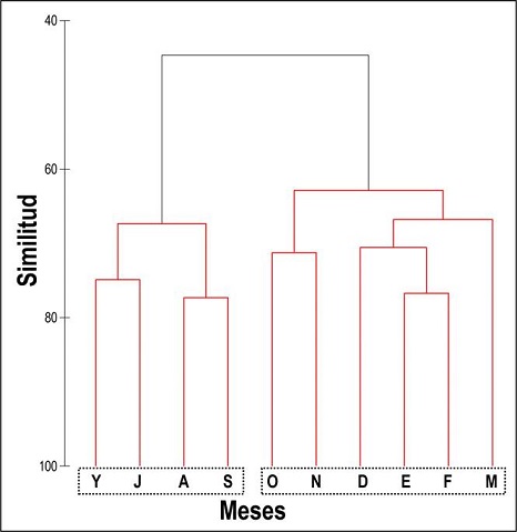 Tras la prueba SIMPROF, el dendrograma reveló la existencia de sólo dos clusters de meses estadísticamente significativos (P = 0.001): primero, el grupo formado por los meses que van de mayo a septiembre (‘primavera-verano’); después, el resto de meses (‘otoño-invierno’) (Figura 2); no fue estadísticamente significativa la estructura interna del primero (P = 0.336) ni del segundo (P = 0.589) de estos clusters de meses.