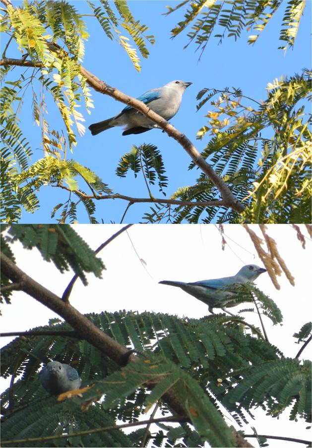 Además del tamaño y color característico del plumaje, consideramos su voz, que es ruidosa, compuesta por vocalizaciones suaves mezcladas con silbidos agudos y, cuya onomatopeya castellanizada es tssiuu-tssiuu seguido de notas breves y, repetitivas; esta voz es coherente con cantos grabados de T. episcopus disponibles (Macaulay Library 2016, Xeno-canto 2016). Durante el avistamiento de un primer individuo, arribó otro con el que comenzaron a realizar despliegues y comunicación con movimientos, aparentemente de cortejo, para después volar hacia un árbol de pistache (Pistacia vera) ubicado al sur del patio de la catedral de San Luis Acatlán, donde forrajearon en el dosel durante seis minutos, después volaron hacia el sur de la ciudad. Posteriormente, en diferentes fechas y horarios durante los meses de julio, agosto y septiembre de 2016, hicimos avistamientos de tres individuos; de los cuales uno o dos adultos aportaron cuidados parentales a un juvenil, a juzgar por los acercamientos y el aleteo del inmaduro que solicitaba ser alimentado por el adulto, en la localidad de Jolotichán (16º45’07.30” N, 98º43’56.00” O, 279 msnm), situada a 5 km al sur de la cabecera municipal San Luis Acatlán. El 20 de diciembre de 2016 a las 7:35 h observamos a cuatro individuos de tángara azul gris durante 1 h forrajeando en los árboles de parota (Enterolobium cyclocarpum) y palo de rosa (T. rosea), en un predio arbolado en el extremo norte de la ciudad de San Luis Acatlán, mismos que fotografiamos con una cámara Nikon D5100 con un lente Nikon 55-300 mm (Figura 1).