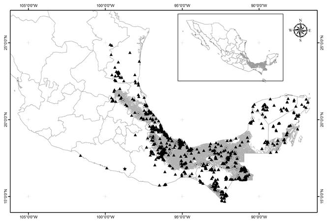 El área de distribución de las especies es dinámica, pero los registros que cambian las áreas de distribución deben ser analizados a través de criterios que permitan valorar su relevancia. Entre ellos se incluyen los primeros reportes para una entidad política, para una región biótica diferente a donde se ha registrado previamente, o la confirmación de su presencia en áreas donde se consideraba inexistente o no hay información publicada (Sánchez-González 2013). La tángara azul gris (Thraupis episcopus) es una especie residente de afinidad neotropical, su distribución conocida comprende desde el este de México, hacia el sur a través de Centroamérica, Colombia, Venezuela, norte de Bolivia, la Amazonia peruana y brasileña, y en el Caribe en Trinidad y Tobago (Miller et al. 1957, Clements 2007, Schulenberg et al. 2007, Hilty 2016). En México se distribuye en áreas geográficas de baja altitud, del nivel del mar hasta los 1500 m (Howell y Webb 1995), en los estados desde el centro-sur de Nuevo León, Tamaulipas, San Luis Potosí, Hidalgo, Puebla, Veracruz, norte al sureste de Oaxaca, Tabasco, Campeche, Yucatán y Quintana Roo (Navarro-Sigüenza et al. 2004, Navarro y Peterson 2007, Monroy-Ojeda y Grosselet 2008). En la vertiente del Pacífico mexicano se distribuye en una franja de la costa y de la Sierra Madre de Chiapas (Howell y Webb 1995). De acuerdo con Peterson y Chalif (1998) su área de distribución incluye parte del estado de Guanajuato, y no se encuentra presente en Nuevo León; aunque posteriormente Howell y Webb (1995) señalaron que los registros de Peterson y Chalif (1998) para Guanajuato fueron incorrectos.