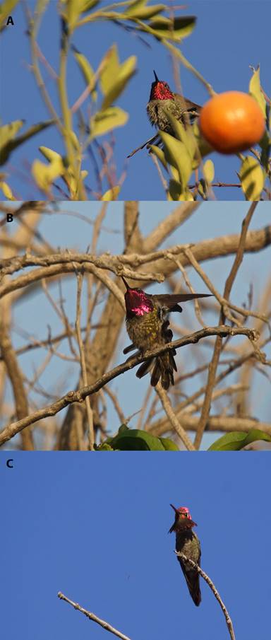 En la Comarca Lagunera residen el colibrí barba negra Archilochus alexandri y el colibrí lucifer Calothorax lucifer. En migración es posible ver otras dos especies que son el colibrí garganta rubí A. colubris y el zumbador canelo Selasphorus rufus. El colibrí cabeza roja macho tiene un plumaje que no se puede confundir con estas cuatro especies. En el presente estudio reporto 136 avistamientos de colibrí cabeza roja de las cuales 116 son de machos adultos o adultos jóvenes. Estas observaciones fueron incidentales, en salidas para observar pájaros, sin una metodología preestablecida o sistemática. La mayoría de las observaciones fueron del colibrí cantando perchado. En ocasiones pude observarlos alimentándose de flores de maguey (Agave sp.) y una sola vez en flores de buganvilia (Bougainvillea sp.). En seis ocasiones el colibrí tuvo un despliegue de bombardeo, remontando alturas mayores a los 20 m para luego caer en picada contra algún objetivo en la copa de un árbol. Éste es clasificado como una conducta de agresión (Stiles 1982), pero desgraciadamente en ninguna de las ocasiones pude ver cuál era su blanco. Nunca observé otros despliegues de tipo nupcial como el vuelo en columpio descrito por el mismo Stiles (1982).