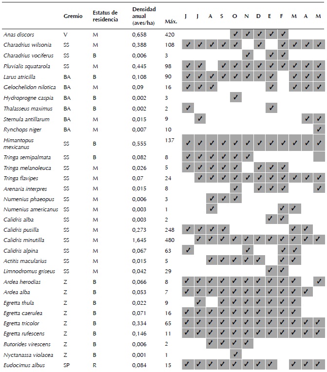 Observamos un total de 42 especies de aves acuáticas durante los dos años de estudio (Cuadro 1), pertenecientes a 9 órdenes y 15 familias. Los órdenes con mayor número de especies fueron Charadriiformes y Ciconiiformes, con 22 y 10 respectivamente, y las familias con mayor riqueza de especies fueron Scolopacidae, Ardeidae y Laridae, con 12, 8 y 6 especies respetivamente. Los órdenes con mayor abundancia relativa anual fueron Phoenicopteriformes con un 46%, Charadriiformes con un 37%, Ciconiiformes con un 10% y Anseriformes con un 6%.