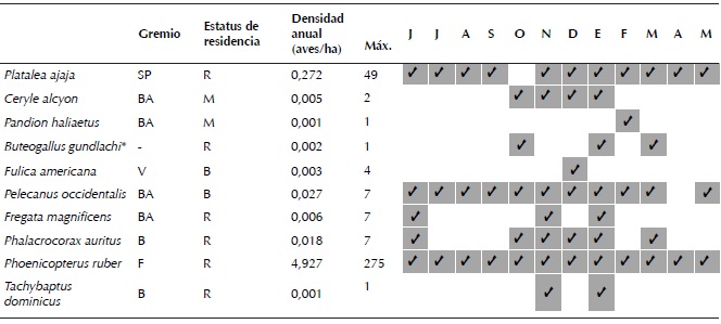 En los transectos contamos las aves acuáticas observadas y escuchadas. Consideramos también especies de aves terrestres que presentan una estrecha relación con estos hábitats y una dieta especializada en organismos acuáticos, como Buteogallus gundlachi (Gavilán Batista) y Pandion haliaetus (Guincho). Categorizamos a las especies de acuerdo con su estatus de residencia según Mugica et al. (2001), en residentes, migratorias y bimodales (especies que tienen poblaciones residentes y migratorias). Además, agrupamos a las especies en gremios alimentarios, según el criterio de Acosta (1998), como sondeador somero, sondeador profundo, buscador aéreo, buceador, zancuda y vegetariano. En el caso de P. ruber, lo clasificamos como un filtrador (Kirkconnell et al., 1992), aunque no puede ser considerada como un gremio, al ser la única especie con esta característica ecológica, se tuvo en cuenta en el análisis de gremios debido a su importancia en el ecosistema. Calculamos la densidad y la riqueza promedio mensual de toda la comunidad, así como por estatus de residencia y los gremios. Para cada especie de ave estimamos la densidad promedio anual (aves/ha) y el rango de abundancia absoluta. Para comparar la densidad y la riqueza mensual calculamos los intervalos de confianza para un 95%, mediante el análisis de Montecarlo con 500 iteraciones, en el programa PopTool versión 3.2 accesorio al Excel (Hood, G.M., 2010. PopTools version 3.2.3. Available on the internet. URL: http://www.poptools.org/).