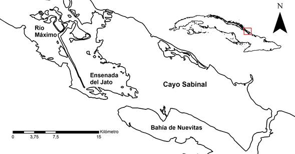 Realizamos este estudio en la Ensenada del Jato (21º38’56” N, 77º21’02” O), ubicada en la costa suroeste de Cayo Sabinal, municipio Nuevitas, Camagüey (Figura 1). Esta área es uno de los humedales más grande del cayo, y se corresponde con una laguna marina, que tiene una profundidad máxima de 1 m y abundantes cayos intermedios de A. germinans. Esta laguna se encuentra rodeada de vegetación de costa por la zona este y de Avicennia germinans (Mangle Prieto) por la oeste. El área se ubica en una zona tropical lluviosa, de clima de sabana, con una temperatura promedio anual de 24.7oC (máx. 33.1oC y mín. 17.0oC) y con una humedad relativa alta. Se presentan dos estaciones, una correspondiente al periodo poco lluvioso (noviembre-abril) y la otra al periodo lluvioso (mayo-octubre); las precipitaciones promedio oscilan entre 1000 mm y 1200 mm anuales. Hicimos los conteos de aves acuáticas desde junio de 2008 a mayo de 2010. Realizamos tres transectos de banda fija de 323 m de longitud y 180 m de ancho, que garantizaban tener una buena representación del área de estudio, y que en el caso particular de las dimensiones del ancho, aprovechaban las facilidades de visibilidad por la poca vegetación y el relieve llano. Los transectos los separamos por una distancia mínima de 100 m, para evitar contar los mismos individuos entre transectos. Los recorridos se hicieron a velocidad constante, con un tiempo promedio de 15 minutos por transecto. En cada año hicimos los muestreos de 2 a 4 veces por mes, entre las 7:30 y las 8:30 de la mañana, en este horario la actividad de las aves acuáticas es mayor (Acosta et al. 2013).