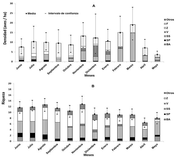 La densidad promedio mensual y su variabilidad fueron mayores en los meses de noviembre, diciembre, febrero y marzo (Figura 2A). Mientras que en el mes de mayo se presentó la menor densidad promedio y su menor variabilidad. Este mes se diferenció, teniendo en cuenta los intervalos de confianza al 95%, de los meses de mayor densidad. En el análisis de los gremios, los vegetarianos aumentaron sus densidades en el mes de diciembre. En el resto de los meses, la densidad de los filtradores fue mayor por la abundancia de P. ruber, seguidos por los sondeadores someros, debido al porte en abundancia de Calidris minutilla, Himantopus mexicanus, Pluvialis squatarola y Charadrius wilsonia. En el mes de marzo, particularmente, el aumento de la densidad general estuvo asociado al predominio de los sondeadores someros. Para la riqueza, la variabilidad fue bastante parecida entre meses, con valor máximo en noviembre y el mínimo en abril (Figura 2B). El gremio con mayor número de especies fue el de sondeadores someros con 16, seguidos por las zancudas y buscadores aéreos, con 8 y 10 especies respectivamente (Cuadro 1).