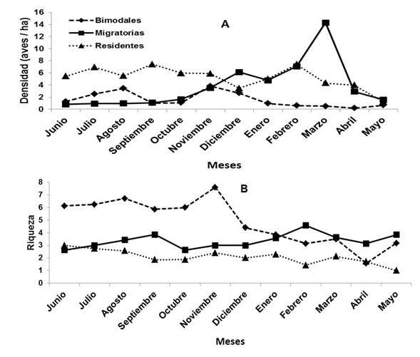 Las especies migratorias empezaron a aumentar en abundancia promedio mensual a partir de noviembre y alcanzaron un valor máximo de 14 aves/ha en marzo (Figuras 3A y B). Esta variación, sin embargo, no estuvo acompañada de cambios grandes en el número de especies. Cabe destacar que 13 de las 19 especies migratorias pertenecen al gremio de los sondeadores someros. Las especies bimodales no presentaron valores grandes de densidad, aunque estuvo representado por el mayor número de especies de junio a noviembre. La densidad y la riqueza de las especies residentes se mantuvo de manera estable a lo largo de todo el año, grupo en el que se encuentra P. ruber, la especie con la mayor densidad en el área de estudio.