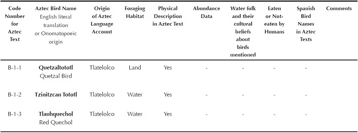Accordingly, in the present paper, I use content analysis of the bird accounts, combined with the comparative method, to discover significant new information about the historic ornithological project of Sahagún’s research group. Specifically, I ask and answer the following new question: Did the contributions of the Aztecs from Tenochtitlan differ from those of Tlatelolco and, if so, how did they differ?