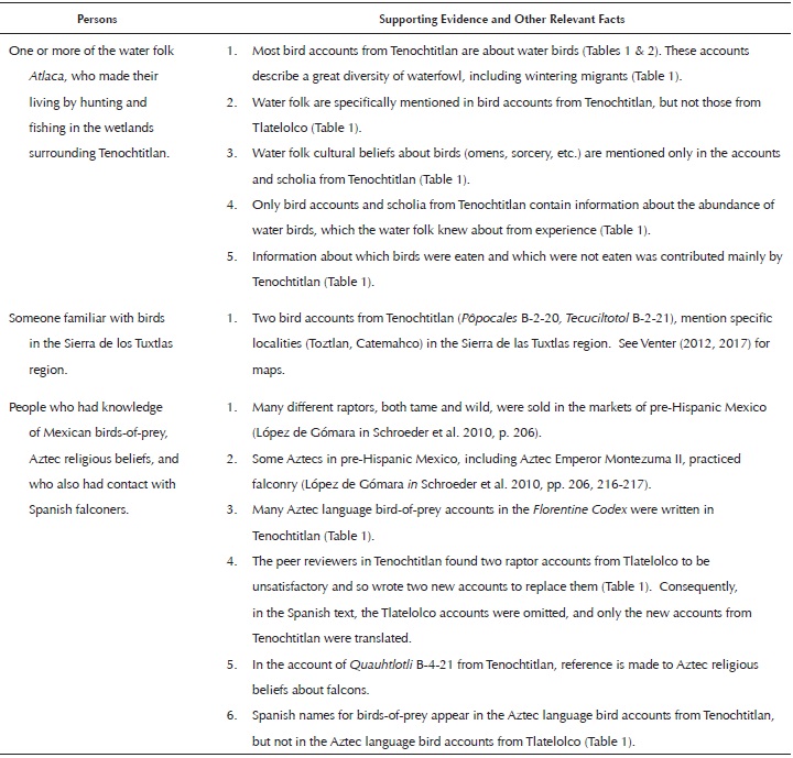 Although the names of these Tenochca have been lost, we can make some intelligent guesses about who some of them were by analyzing the information they provided the research group either in person or in pictorial manuscripts (Table 3). For example, the focus of the Tenochtitlan accounts on water birds, edible bird species, avian abundance, and their many references to the water folk (Atlaca), all suggest that the research group collaborated with one or more persons from the Atlaca while working in Tenochtitlan (Table 1, Table 3).
