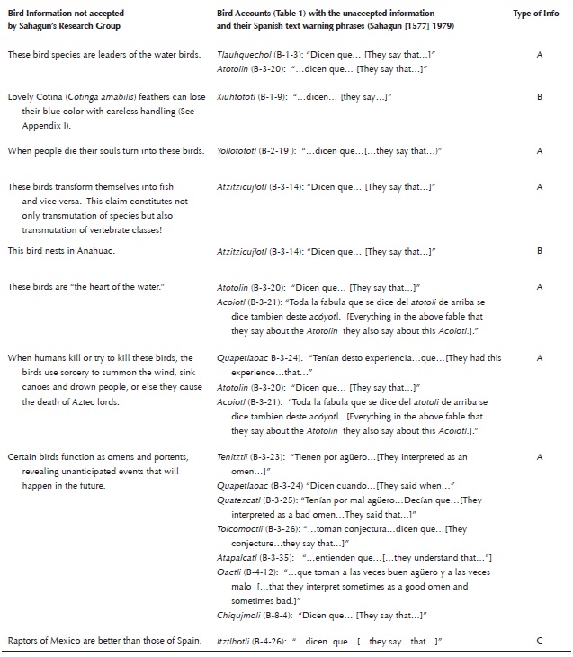 At that early stage of ornithology, with so many of the world’s birds still unknown to science, ornithology was by necessity descriptive, involving primarily the accumulation of basic knowledge about birds and the separation of fact from fable (Table 4). Sahagún’s research group participated in this great work by combining the then established and accepted Aristotelian method of gathering factual information from knowledgeable persons and dependable manuscripts, with newer research methods that included the use of formalized questionnaires and peer review (López Austin 1974, Haemig 2012, 2014). The research group took the bird knowledge of the Aztec people and, separating away the fables, myths and unverifiable information (Table 4) from the facts, produced an authentic regional avifaunal work about “the better known and most utilized…birds” of México.