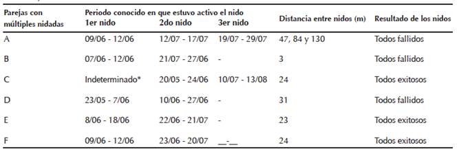 Las parejas se mantuvieron juntas toda la temporada de estudio (n = 6 parejas). En varias parejas identificadas observamos reanidación dos veces (n = 4 parejas) y tres veces (n = 2 parejas). El número de días entre las nidadas fue variado, con un promedio de 12 días. En los nidos fallidos (n = 3), transcurrieron de dos a nueve días desde la pérdida del nido hasta el inicio de la construcción del siguiente nido. En los nidos exitosos (n = 3 parejas), transcurrieron de cuatro a 22 días desde que el último volantón salió del nido hasta el inicio de la construcción del siguiente nido. En el caso de las parejas exitosas en su primer intento, todas las nidadas sucesivas fueron exitosas, mientras que lo contrario ocurrió para las parejas que fracasaron en el primer intento, es decir, fallaron en intentos posteriores (Cuadro 1).