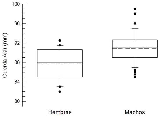 De acuerdo con las medidas morfológicas, encontramos diferencias significativas en la cuerda alar entre hembras y machos (t = -5.05, gl = 106, P < 0.001). En las hembras (n = 30) la cuerda alar fue de 87.68 ± 3.04 mm, con un rango de 82.00 a 92.50 mm (IC al 95% 86.50 - 88.80 mm); y en los machos (n = 78) de 90.90 ± 2.93 mm con un rango de 85 a 99 mm, (IC al 95% 90.24 - 91.56 mm) (Figura 1). Por otro lado, encontramos que las hembras fueron más pesadas que los machos durante la temporada de reproducción, entre el 1 mayo y el 31 de julio (♀: 34.8 ± 3.1 g, n = 20, ♂: 32.1 ± 1.9 g, n = 48, t = 4.34, gl = 66, P < 0.001). Las diferencias son probablemente debidas a que en la temporada reproductiva las hembras tienen en su interior huevos y más grasa que los machos.