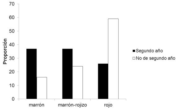 Las aves de segundo año, las cuales presentaron plumas alares juveniles, poseían los ojos frecuentemente de coloración marrón (G = 8.55, gl = 1, P = 0.003), mientras que las aves que no fueron identificadas de segundo año presentaron los ojos rojizos (G = 13.25, gl = 1, P < 0.001) (Figura 2). Por lo tanto, el color del ojo puede ser un criterio suplementario para determinar la edad, además de la presencia de rémiges juveniles en las alas. Sin embargo, este criterio faltaría evaluarlo con aves de edad conocida.