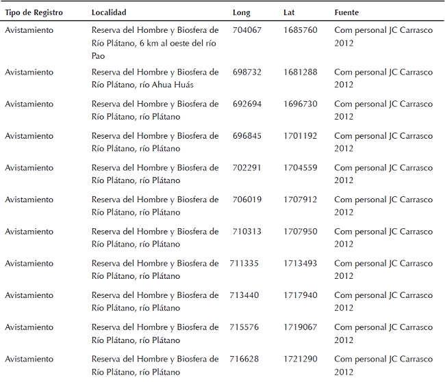 Utilizamos 41 datos provenientes de registros del monitoreo biológico del Proyecto de Biodiversidad de Áreas Prioritarias (PROBAP/AFE-COHDEFOR), así como observaciones y comunicaciones personales de recorridos en el río Plátano y Rus Rus (Anexo) (Tabla 1). Estos datos incluyen localidad con coordenadas geográficas y fecha, se consideran apropiadas para la modelación (Phillips et al. 2006).