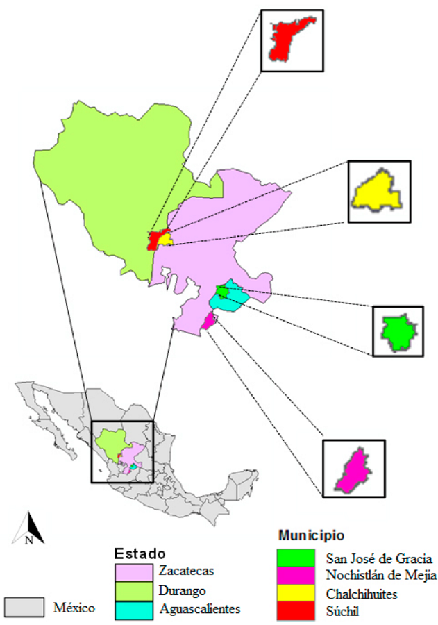 El presente estudio lo realizamos de julio de 2015 a julio de 2016 en cuatro municipios de la Sierra Madre Occidental, México (Figura 1):