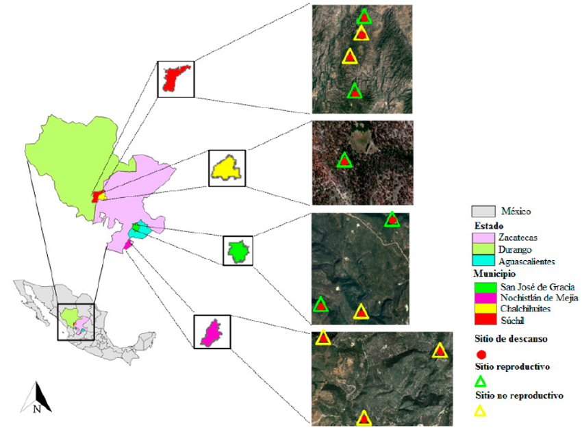 Los estudios sobre las características del hábitat en sitios de descanso del BM en Aguascalientes se realizaron hace aproximadamente 15 años (Tarango et al. 2001; Márquez et al. 2002). En estos estudios sólo se evaluaron los sitios de descanso y sitios no aleatorios. Adicionalmente, estos estudios y el de Zacatecas (Palma-Cancino et al. 2014) no describieron las características del hábitat de sitios seleccionados por parejas reproductivas. Y como los bosques han sufrido cambios en su estructura por el aprovechamiento forestal, incendios forestales y contaminación, son necesarios más estudios sobre S. o. lucida.