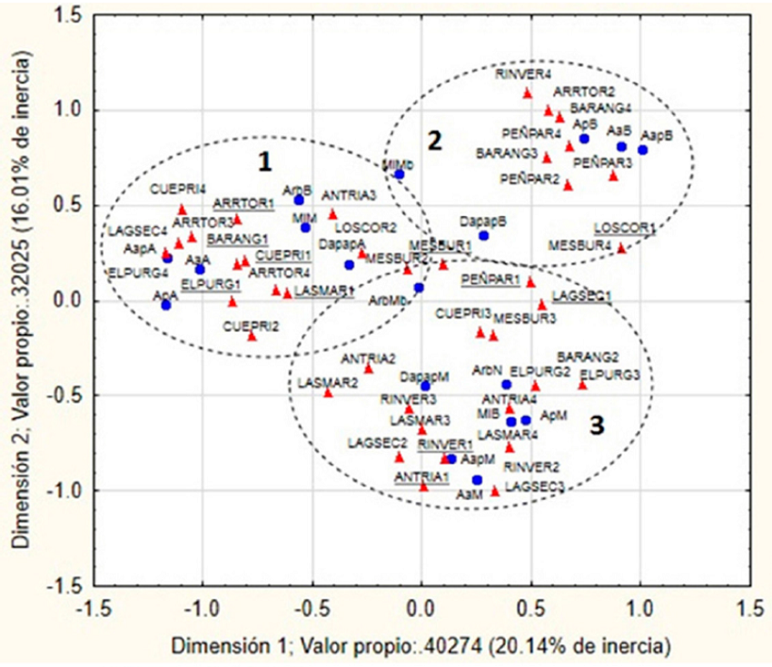 El mejor modelo de regresión Poisson presentó un AIC = 87.5 y sus resultados sugieren que seis variables del hábitat presentaron el mayor efecto sobre las frecuencias de S. o. lucida, sobresaliendo las variables diámetro a la altura del pecho del árbol de percha, cobertura arbustiva del suelo y la altura del árbol de percha (Cuadro 9). El ACS mostró una asociación entre las frecuencias de S. o. lucida y las variables categóricas del hábitat, identificadas como variables significativas en el ARP. Las dimensiones consideraron el 36.1% de la inercia total e identificaron una asociación de los búhos en tres conjuntos de variables biológicas categóricas (Figura 3). Los conjuntos 1 y 3 definen la selección de los búhos por la altura de árboles de percha, la altura de percha y la altura de árboles de media a alta, así como el DAP del árbol de percha media, sobresaliendo la variable categórica de arbustos nula.