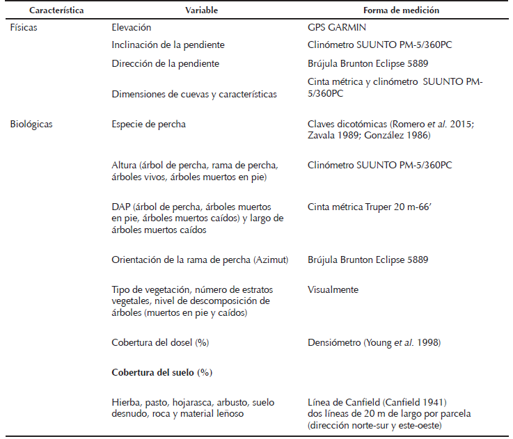 Una vez localizados los búhos y determinado sus sitios de descanso, procedimos a evaluar variables del hábitat en parcelas circulares de 20 m (314.2 m2) de diámetro (Solis y Gutiérrez 1990), una por sitio de descanso y considerando el árbol de percha como su centro. En los casos en que el sitio de descanso fue una cueva, la parcela de evaluación la establecimos tomando como centro el árbol más cercano que tuviera un diámetro a la altura del pecho (DAP) ≥ 20 cm, en éstas parcelas evaluamos las variables físicas y biológicas (hábitat) (Cuadro 1). Asimismo, a cada parcela evaluada le asignamos una clave de identificación, así como el nombre de la localidad, registramos la fecha y hora de evaluación, su altitud (msnm) y las coordenadas geográficas (latitud y longitud). Para definir una posible selección de algunos atributos del hábitat por esta especie, evaluamos tres parcelas seleccionadas aleatoriamente por cada sitio de descanso (sitio reproductivo o sitio no reproductivo), excepto para un sitio donde sólo evaluamos una parcela aleatoria debido al difícil acceso a la zona. Estas parcelas las establecimos a distancias de 50, 100 o 150 m del centro del sitio de descanso, seleccionamos una dirección aleatoria (N, S, E, O, NE, NO, SE, SO) y cuantificamos las mismas variables que en los sitios de descanso (Cuadro 1).