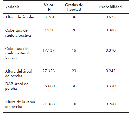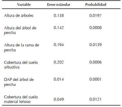 Seis variables del hábitat presentaron coeficientes estadísticamente significativos sobre los individuos de S. o. lucida registrados, y sobresalieron el DAP del árbol de percha, cobertura arbustiva del suelo y la altura del árbol de percha. Esta información es congruente con los resultados obtenidos para esta especie (Seamans et al. 1995, Hathcock y Haarmann 2008, Willey y Van-Riper III 2014).