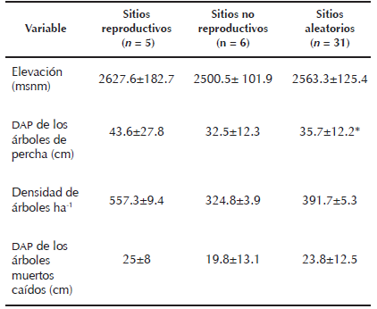 En los sitios de descanso reproductivos (SDR = 5), la densidad de árboles, fue mayor estadísticamente que la de los sitios de descanso no reproductivos (SDNR = 6) y sitios aleatorios (SA = 31) (P < 0.05). Aunque la elevación en los SDR fue mayor (2627.6) que la de los SDNR (2500.5) y SA (2563.3 msnm) y los árboles de percha y los árboles muertos sobre la superficie del suelo de los SDR presentaron un mayor diámetro, comparados con los sitios de descanso no reproductivos y aleatorios (Cuadro 6), estos valores no fueron diferentes estadísticamente (P > 0.05).