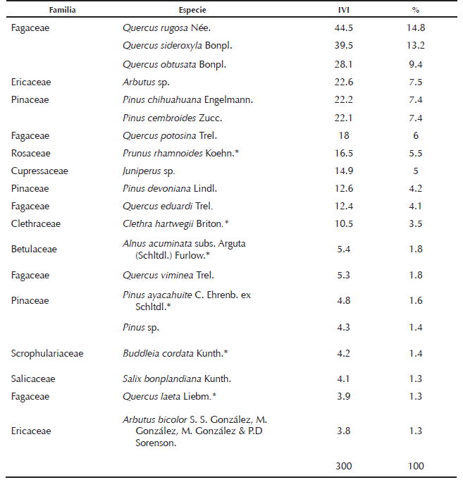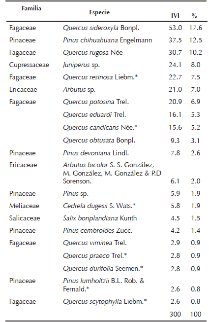 En los sitios de descanso y aleatorios identificamos 27 especies de plantas arbóreas. Sin embargo, las más sobresalientes con un IVI acumulado de 59.7% en los sitios de descanso fueron Quercus rugosa Née, Quercus sideroxyla Bonpl., Quercus obtusata Bonpl., Arbutus sp. Pinus chihuahuana Engelmann, Pinus cembroides Zucc (Cuadro 7). En los sitios aleatorios, las especies con un IVI acumulado de 69.7% fueron Quercus sideroxyla Bonpl., Pinus chihuahuana Engelmann, Quercus rugosa Née., Juniperus sp, Quercus resinosa Liebm., Arbutus sp. y Quercus potosina Trel. (Cuadro 8).
