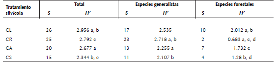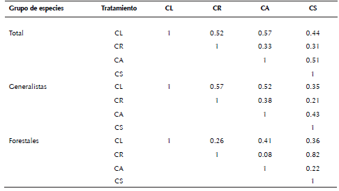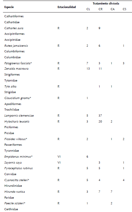 La abundancia y riqueza de las especies fueron significativamente diferentes entre los tratamientos silvícolas (χ2 = 288.7, gl = 102, p < 0.0001). Las abundancias más altas corresponden a las especies de colibríes, Lampornis clemenciae e Hylocharis leucotis, y sólo fueron registradas en las áreas de corta de regeneración. Por otra parte, M. occidentalis y J. phaeonotus las registramos en todos los tratamientos silvícolas; P. sclateri y C. rubra las observamos en las áreas sujetas a cortas de aclareo y liberación; A. pileatus y P. melanocephalus sólo las registramos en las áreas de corta de regeneración. E. minimus sólo la observamos en las cortas de liberación (Cuadro 1). Considerando sus requerimientos de hábitat observamos diferencias significativas en abundancia y riqueza de especies entre tratamientos tanto para especies generalistas (χ2 = 149.13, gl = 69, p < 0.0001) como forestales (χ2 = 45.05, gl = 24, p = 0.005). La mayor riqueza de especies generalistas la observamos en las cortas de regeneración. Para especies forestales la mayor riqueza la observamos en las cortas de liberación, y la menor en las cortas de regeneración (Cuadro 2).
