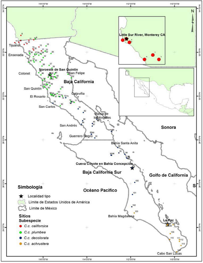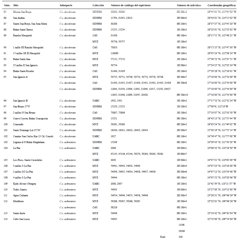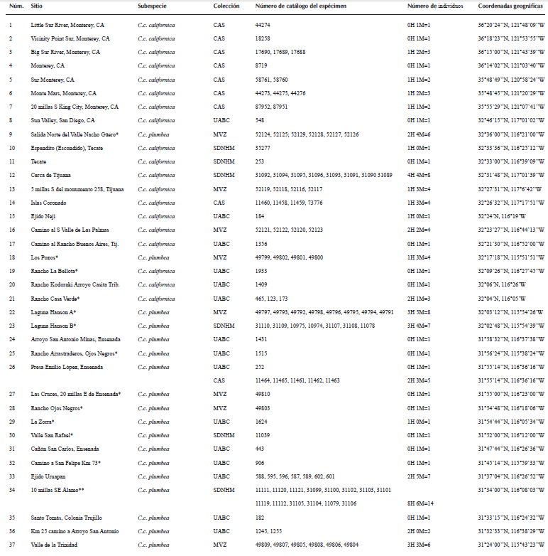 En el análisis comparativo de especímenes entre localidades tipo de las subespecies peninsulares, incluimos especímenes de referencia de la subespecie norteña C.c. californica. Las localidades tipo son aquellos sitios de donde proceden los especímenes utilizados para la descripción original de la subespecie en cuestión de acuerdo con Grinnell (1926, 1931), Ridgway y Friedmann (1946) y Van Rossem (1946).