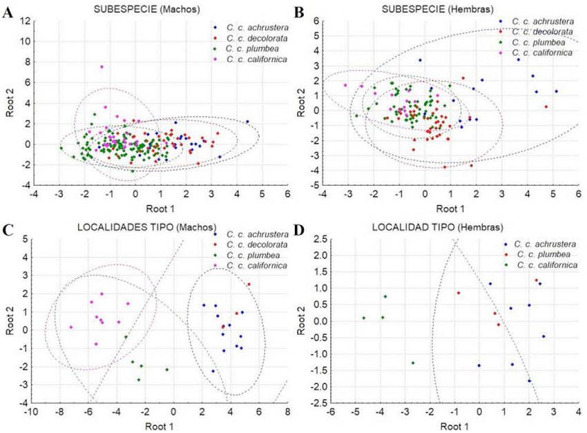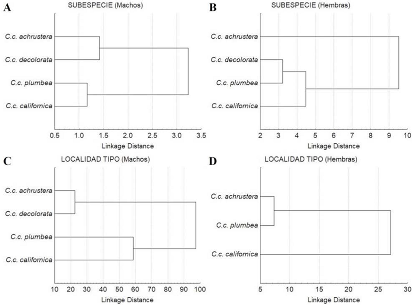 En el diagrama de árbol generado por las distancias cuadráticas de Mahalanobis (D2) se distinguen dos subdivisiones, una integrada por las subespecies de la región central (C.c. decolorata) y sureña (C.c. achrustera) y la otra subdivisión conformada por las subespecies norteñas (C.c. plumbea y C.c. californica) (Figura 9A). En el diagrama de dispersión de los centroides de los especímenes de las subespecies comparadas (Figura 10A), no se distingue una separación clara entre ellas, existiendo un amplio traslape entre las subespecies C.c. achrustrera y C.c. decolorata, así como entre C.c. plumbea y C.c. californica.