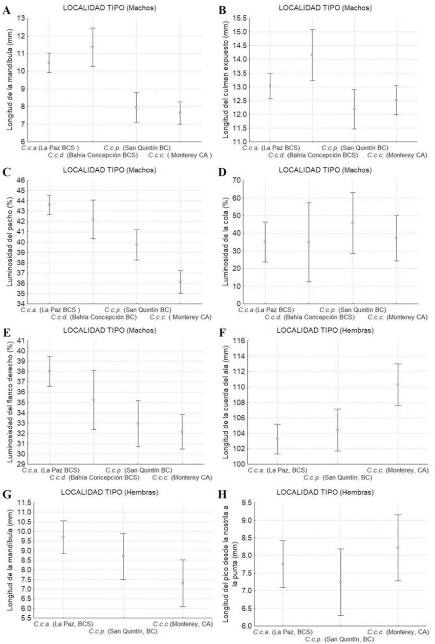En las hembras, los resultados obtenidos mostraron que ninguna variable de color discriminó entre las localidades tipo de las subespecies. Los valores más altos de los caracteres morfométricos se observaron en las hembras de la localidad tipo de la subespecie C.c. californica (Monterey, California, EUA) y C.c. achrustera (La Paz, BCS). La mayor longitud del pico medido desde la nostrila a la punta (Figura 11 H) se registró en la localidad tipo de la subespecie más septentrional (C.c. californica), así como la longitud de la cuerda del ala (Figura 11 F). Sin embargo, la longitud de la mandíbula (Figura 11 G) presentó un patrón latitudinal descendiente, al igual que en los machos, donde las hembras de la localidad tipo de la subespecie más sureña, C.c. achrustera (La Paz, BCS) presentaron los valores más altos de longitud de la mandíbula.