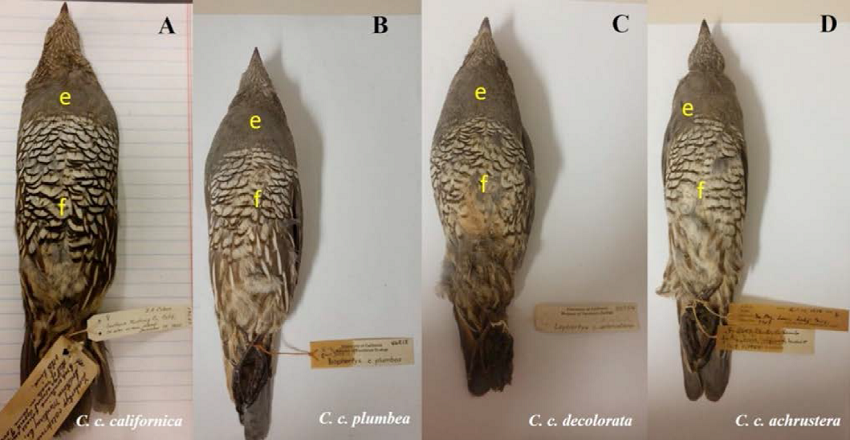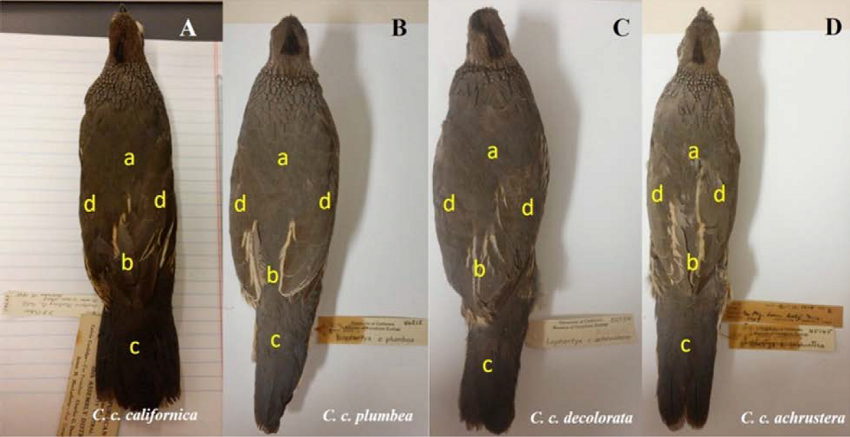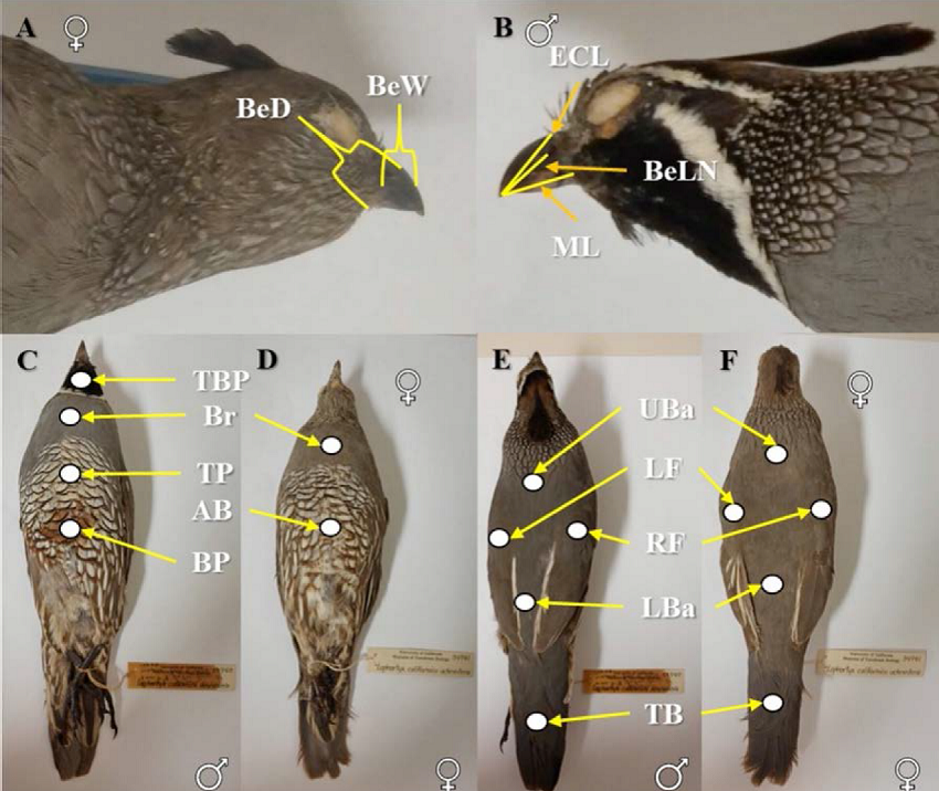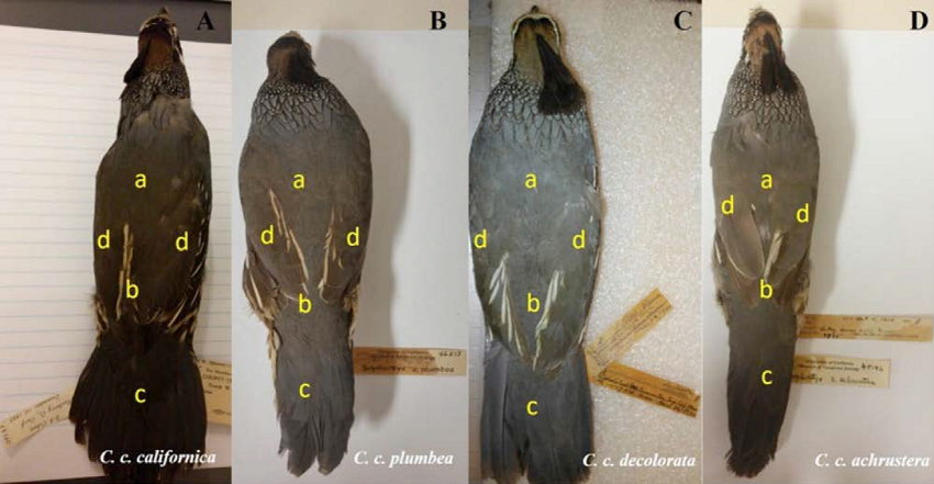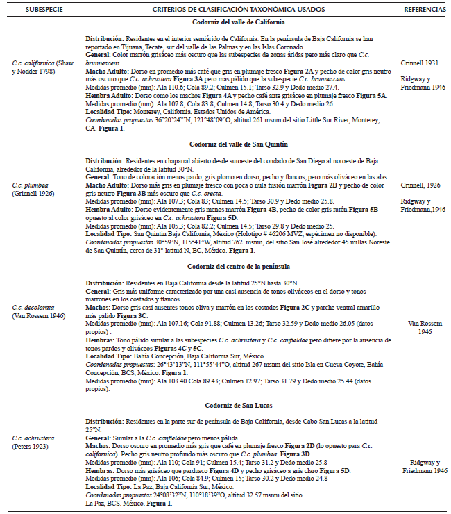 La diferenciación fenotípica entre las subespecies de la codorniz de California ha sido fundamentada en el tamaño corporal, coloración del dorso, pecho y alas, así como tamaño y tonalidad del parche ventral (Van Rossem 1939, 1946; Ridgway y Friedmann 1946). Sin embargo, más allá de los estudios realizados para la descripción de las subespecies peninsulares que fueron basados en un limitado número de caracteres, no existen estudios que hayan evaluado y comparado cuantitativamente la variación fenotípica de las subespecies de C. californica de la península de Baja California.