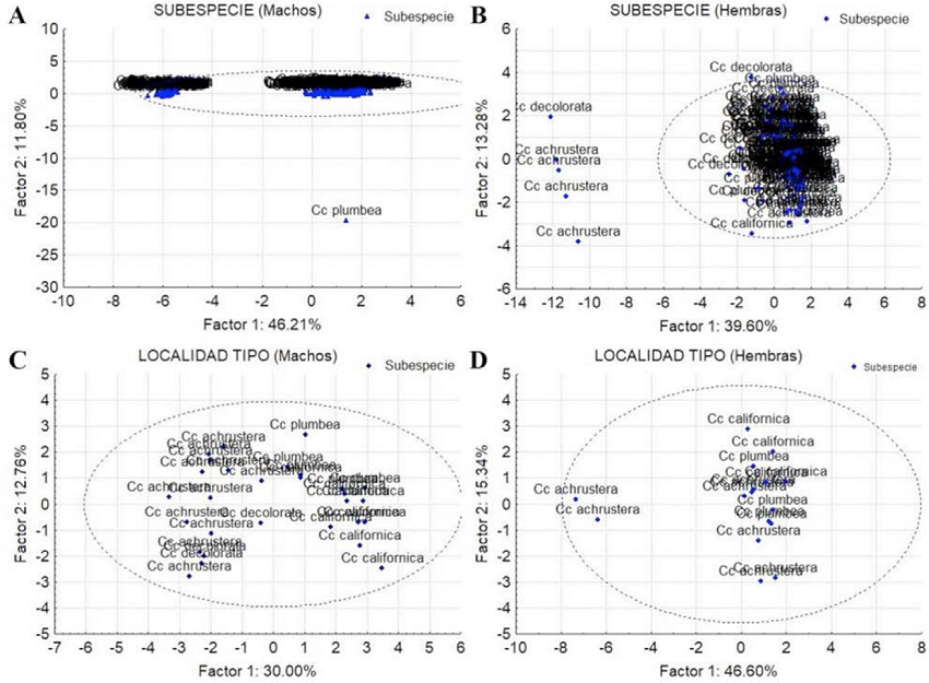 Machos: El análisis incluyó 201 individuos que se clasificaron con un 95% de confianza en un grupo subdividido en dos claramente definidos (Figura 7A). Ambos grupos incluyeron especímenes de todas las subespecies taxonómicas (C.c. californica, C.c. plumbea, C.c. decolorata y C.c. achrustera). Por otra parte, los machos de las localidades tipo (29 individuos) formaron un solo grupo heterogéneo y no se observó una subdivisión (Figura 7C). El traslape entre los especímenes machos de las subespecie se puede observar en las Figuras 10A y 10C con sus respectivos límites de confianza (95%).