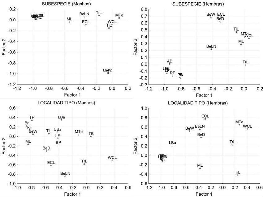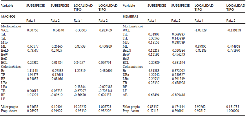 Los resultados de los análisis de función discriminante (AFD) para la comparación de sexos a nivel de subespecies y de localidades tipo son los siguientes: