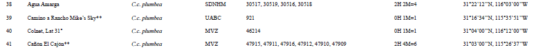 VertNet. 2016. National Science Foundation. Database. Disponible en: Disponible en: http://portal.vertnet.org/search?q=calliplepla+californica+plumbea (consultado el 23 de septiembre de 2016).