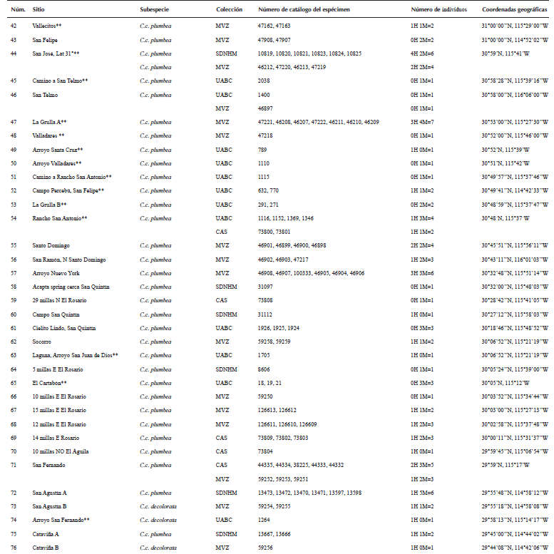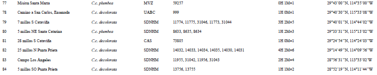 Para el análisis comparativo de las características morfométricas y cromáticas de las subespecies nominales de C. californica obtuvimos datos de 338 especímenes de museo, de los cuales 325 proceden de 107 localidades de la península de Baja California y otros 13 individuos proceden de siete localidades de California, EUA. (Figura 1 y Anexo 1). Los especímenes examinados fueron de las siguientes colecciones ornitológicas: Universidad Autónoma de Baja California (UABC, n = 54), Museo de Historia Natural de San Diego (SDNHM, n = 103), Museo de Zoología de Vertebrados de la Universidad de California Berkeley (MVZ, n = 131) y Academia de Ciencias de San Francisco (CAS, n = 50).